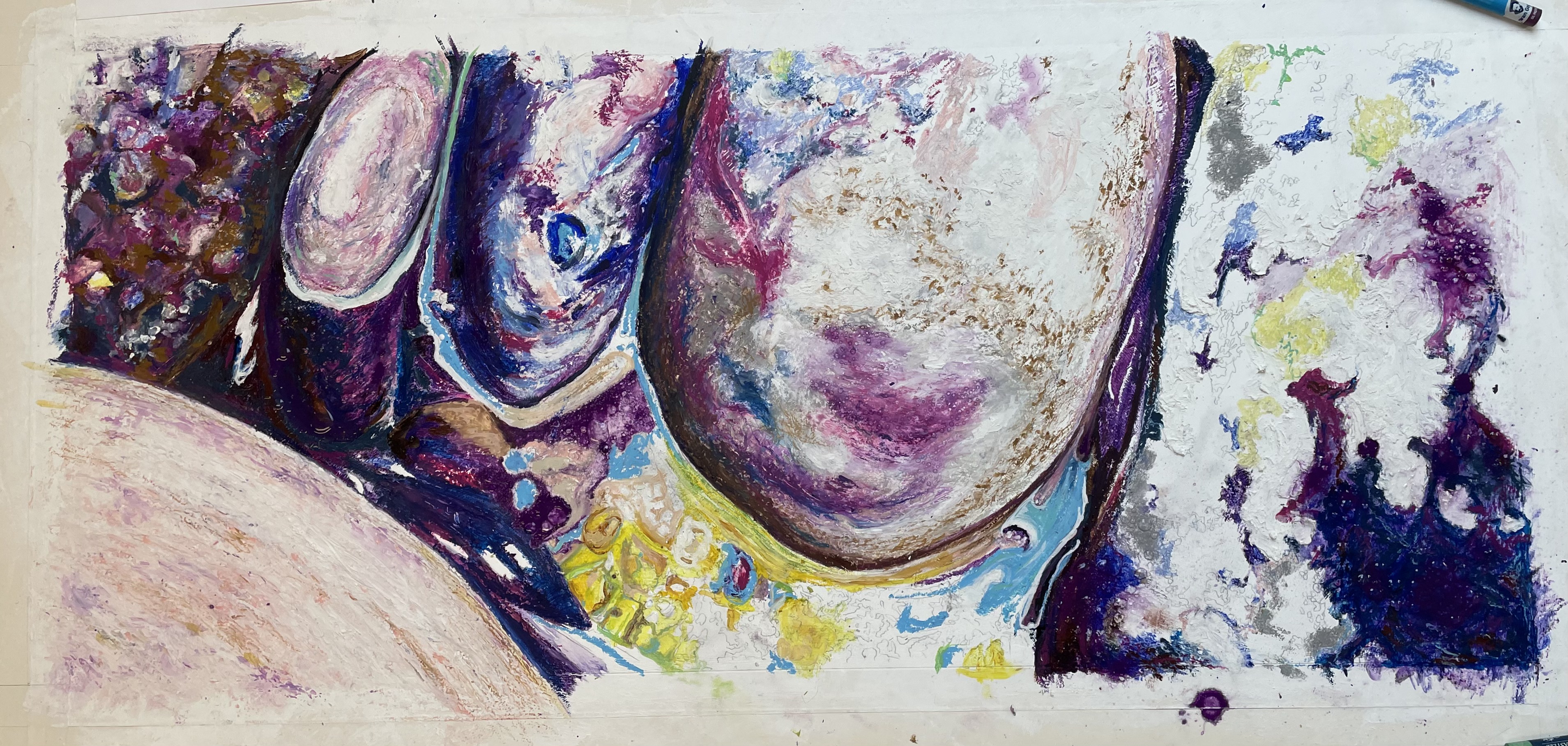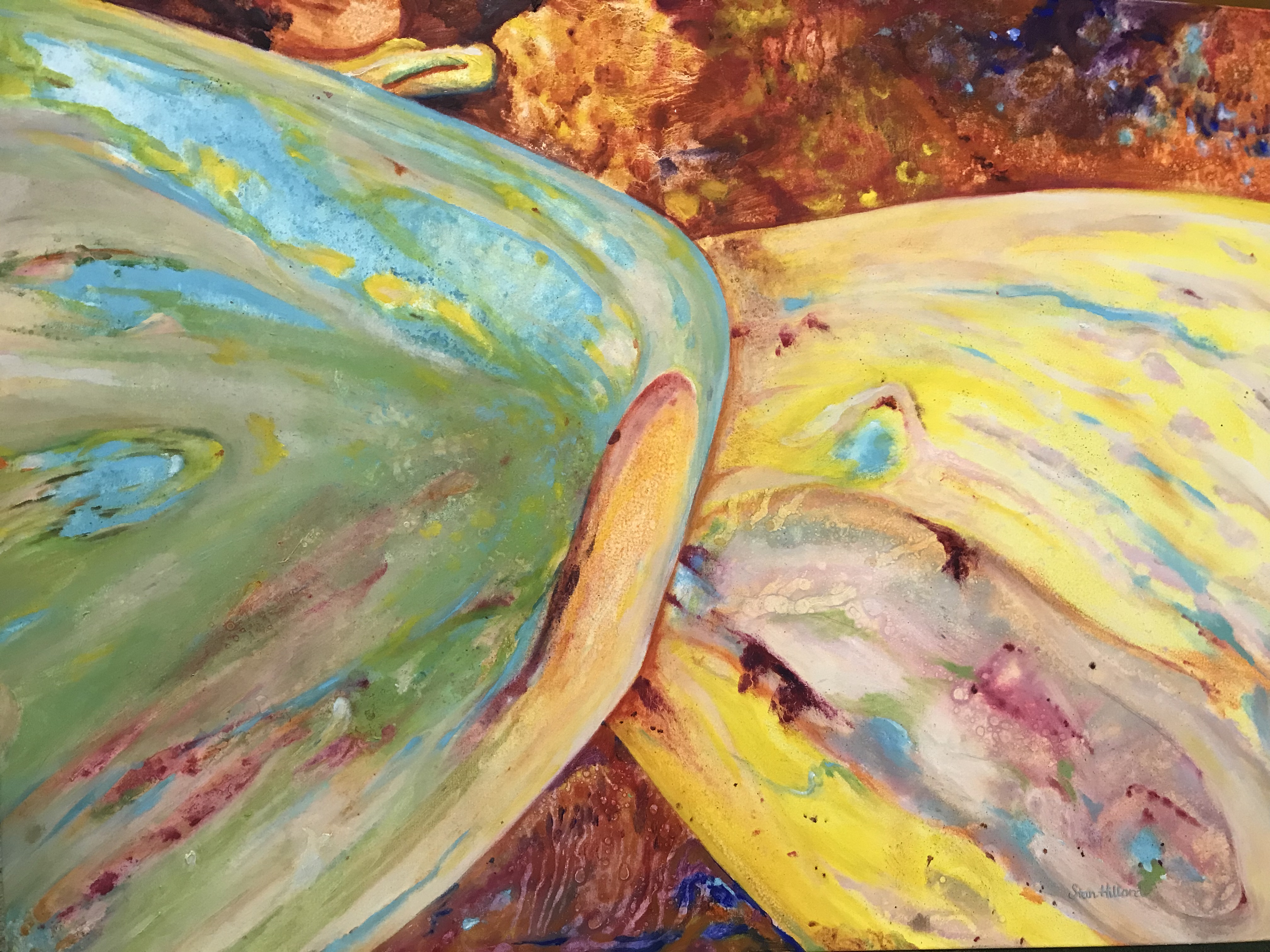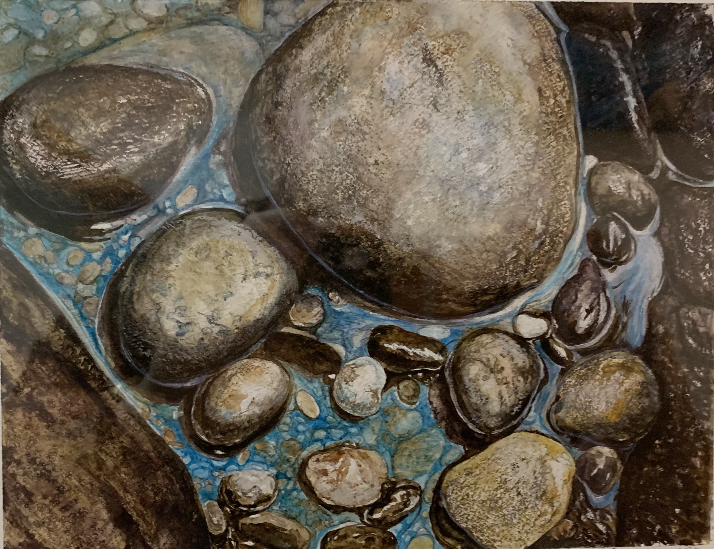 Life as fragile as a decaying leaf exists in a world filled with the potential for pain and sadness at every turn. In this painting, I am that leaf, clustered with other souls that appear to be stronger and more resilient than me. Stones of varying sizes and shapes lying around the leaf represent others who all seem to be better equipped to withstand the onslaught of weathering life’s trials than I am.