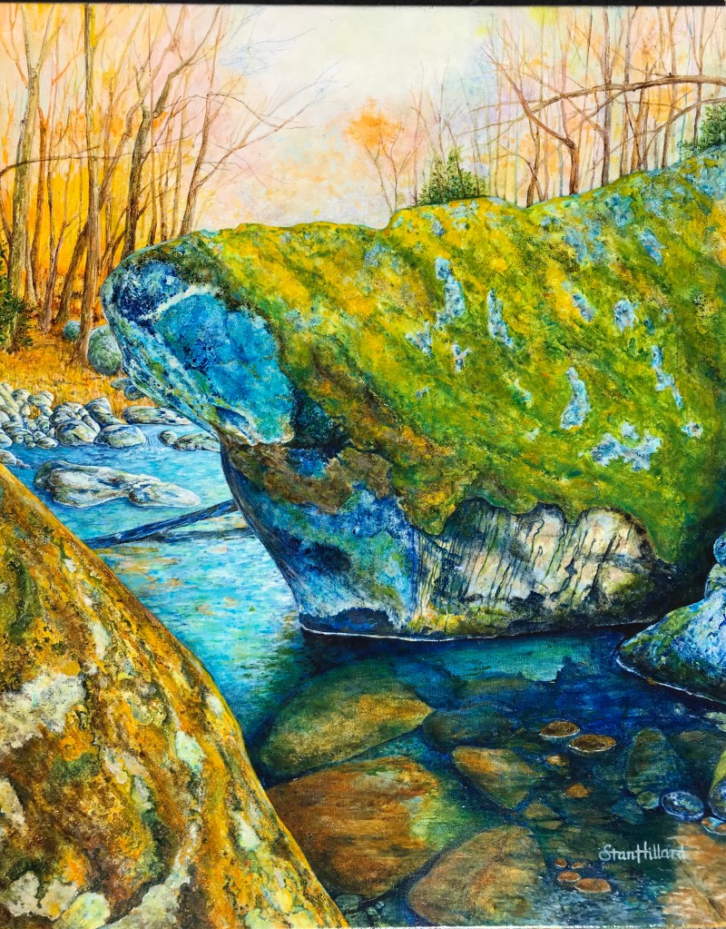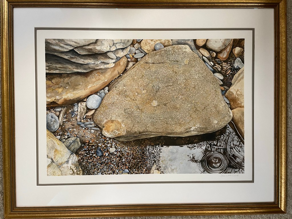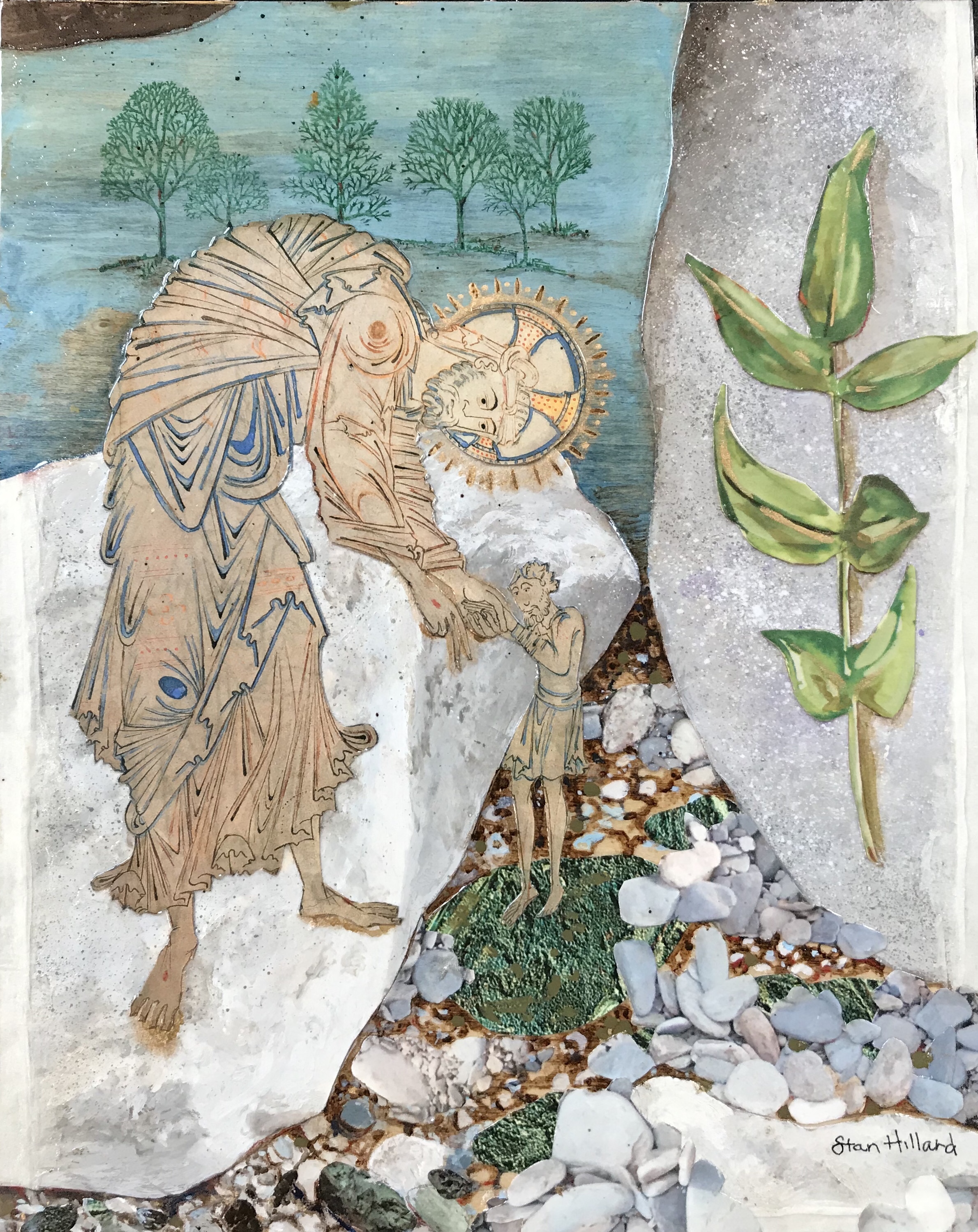 The most important stone in this composition is the sheltering diagonal escarpment that conserves and sustains an environment where the endangered smaller stones can escape the ravages of daily wear. This stone is God the Father, creator of all. He loves the world He created and wants what is best for it even if it is not always aware of His presence and protection. In this painting I intend for those who view it to understand the power of His shelter. Providence is His gift should we be canny enough to accept it.