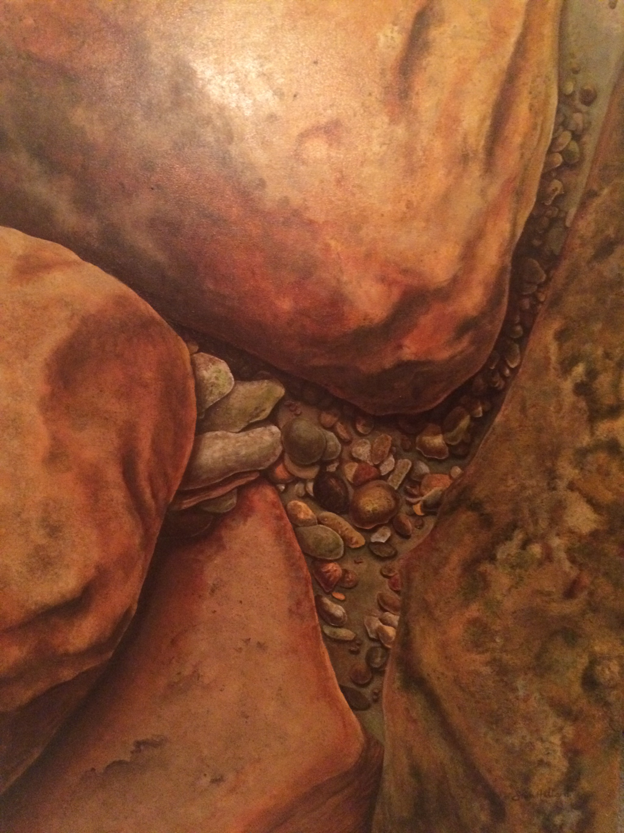 This oil painting is 10” x 20” and symbolically represents my relationship with those I love and those who love me. God the father (The large rock at the top) shelters, protects me, hides me from harm because of His love for me. Jesus (The second largest rock, entering the picture plane from the lower left) is my constant support and a perfect example of how life should be lived. The next two largest stones are similar but slightly different. The less perfect one (on the right) represents me. The more perfect one that touches both of the larger rocks, well, it represents the Holy Spirit, my comforter who is always with me. The smaller stones behind are my family and friends (always supportive and patient with me as I attempt to get “it” right). In the darkest part of the painting there are rocks that represent my sins (They are many and always there to remind me of my failings). Please note that the Holy Spirit is firmly positioned between me and my mistakes. Entering the picture plane from the upper left side, there is a plain, nondescript stone (It looks deceptively normal dosen’t It?) that represents both my past and the deceiver (Satan himself). Please notice that it (He) is completely blocked by the rocks that represent all three branches of the Holy Trinity.  I am hidden, protected by them.  When I rely on them I am free from the control evil used to have over me.